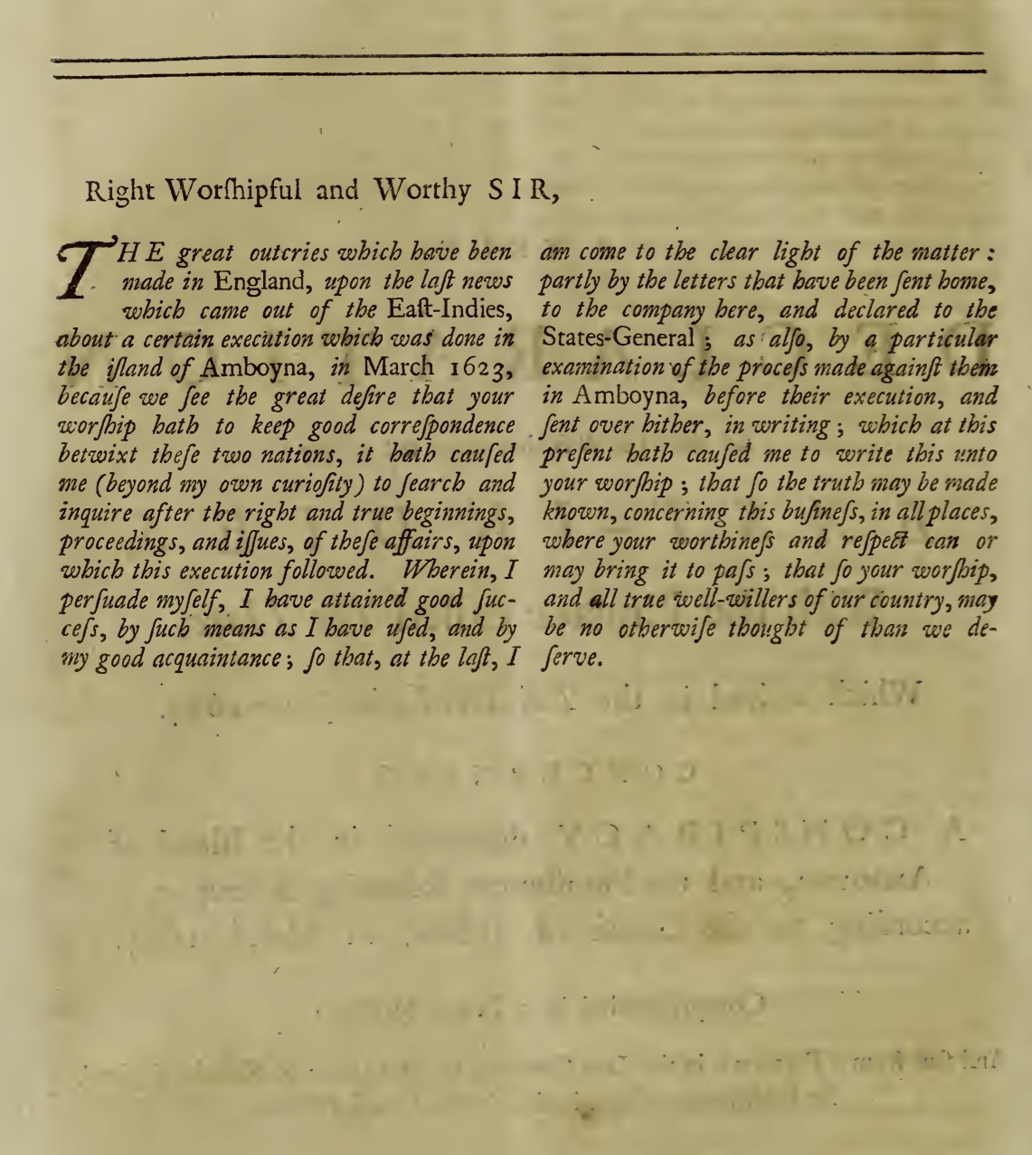 The great outcryes which have been made in England upon the last news which came out of the East Indies about a certain execution which was done in the island of Amboyna in March 1623, because we see the great desire that your Worship hath to keep good correspondence betwixt these two nations, it hath caused me (beyond my own curiosity) to search and enquire after the right and true beginning, proceedings, and issues of these affairs upon which this execution followed. Wherein I persuade myself I have attained good success, by such means as I have used, and by my good acquaintance, so that (at the last), I am come to the clear light of the matter.