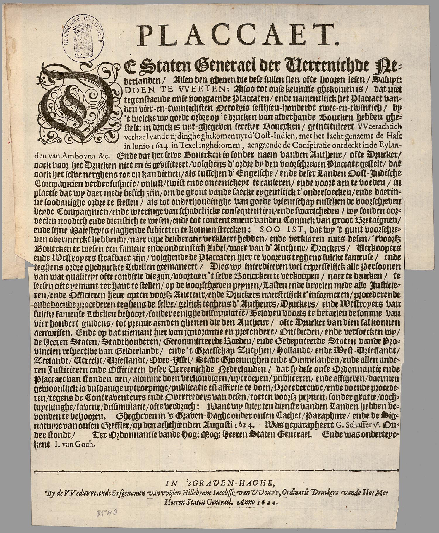 Placard of the States General, against a pamphlet entitled, "The true relation of the tidings which came out of the East Indies by the pinnace called the Hare (which arrived at the Texel in June 1624), concerning the conspiracy which was discovered in the Islands of Amboyna, &c.," declaring it to be "a scandalous and senseless libel, the author whereof, as also the printers, sellers, and dispersers, ought to be punished;" requiring all justices and officers to make diligent inquiry after and proceed against them; and promising a reward of 400 guilders to whomsoever shall produce the author or printer. [This translation comes from the Calendar of State Papers Colonial, East Indies, China and Japan, 1622-1624]