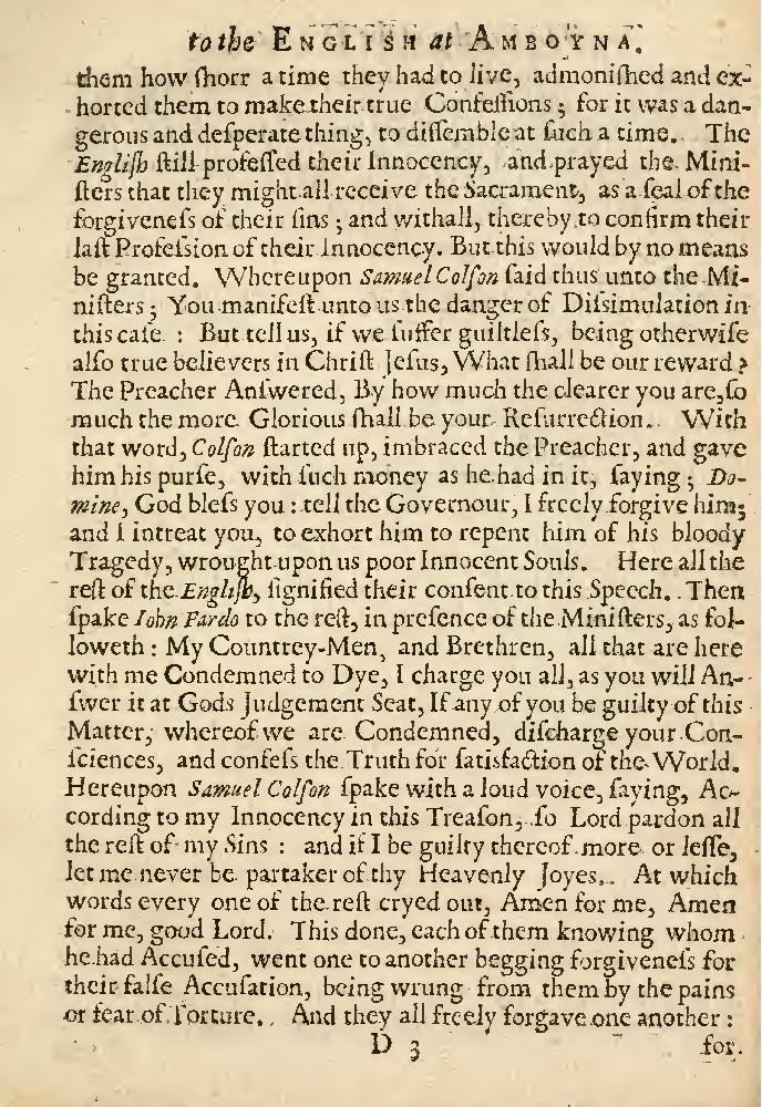 This is an excerpt from a pamphlet produced on the English side in 1624. The purpose of this pamphlet was to damn the Dutch as brutal murders who had deliberately fabricated a conspiracy as a pretext to eject the English from the spice islands. Its author, John Skinner, collected the most explosive testimony presented by the Amboyna survivors and then proceeded to exaggerate it for effect. This scene is a good example and it seems have been largely invented. In it, the English are presented as virtuous, godly victims in sharp contrast with the villainous Dutch. Not only do the English merchants at Amboyna go to their deaths with a pure conscience, but they in fact forgive the Dutch for their terrible crimes against them. Scenes like this fanned the flames of anti-Dutch sentiment in England in this period.
