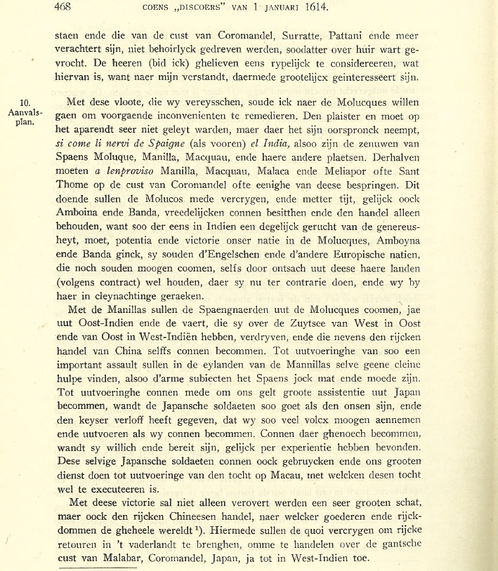 This excerpt comes from a bold plan presented for the Dutch empire in Asia by Jan Pieterszoon Coen, who was Governor-General first from 1619-23 and again from 1627-29. Coen was a firm believer in the value of Japanese mercenaries and he dispatched a string of letters to his subordinates ordering them to recruit as many of these soldiers as possible. Japanese soldiers featured in his most ambitious plans. Rather than being condemned to the defensive, the Company should, Coen wrote, go onto the attack, striking at the great Iberian centers of power: the bustling Portuguese entrepot of Macao and the heavily fortified Spanish colony at Manila. The key to this multipronged assault was the participation of large numbers of Japanese mercenaries.