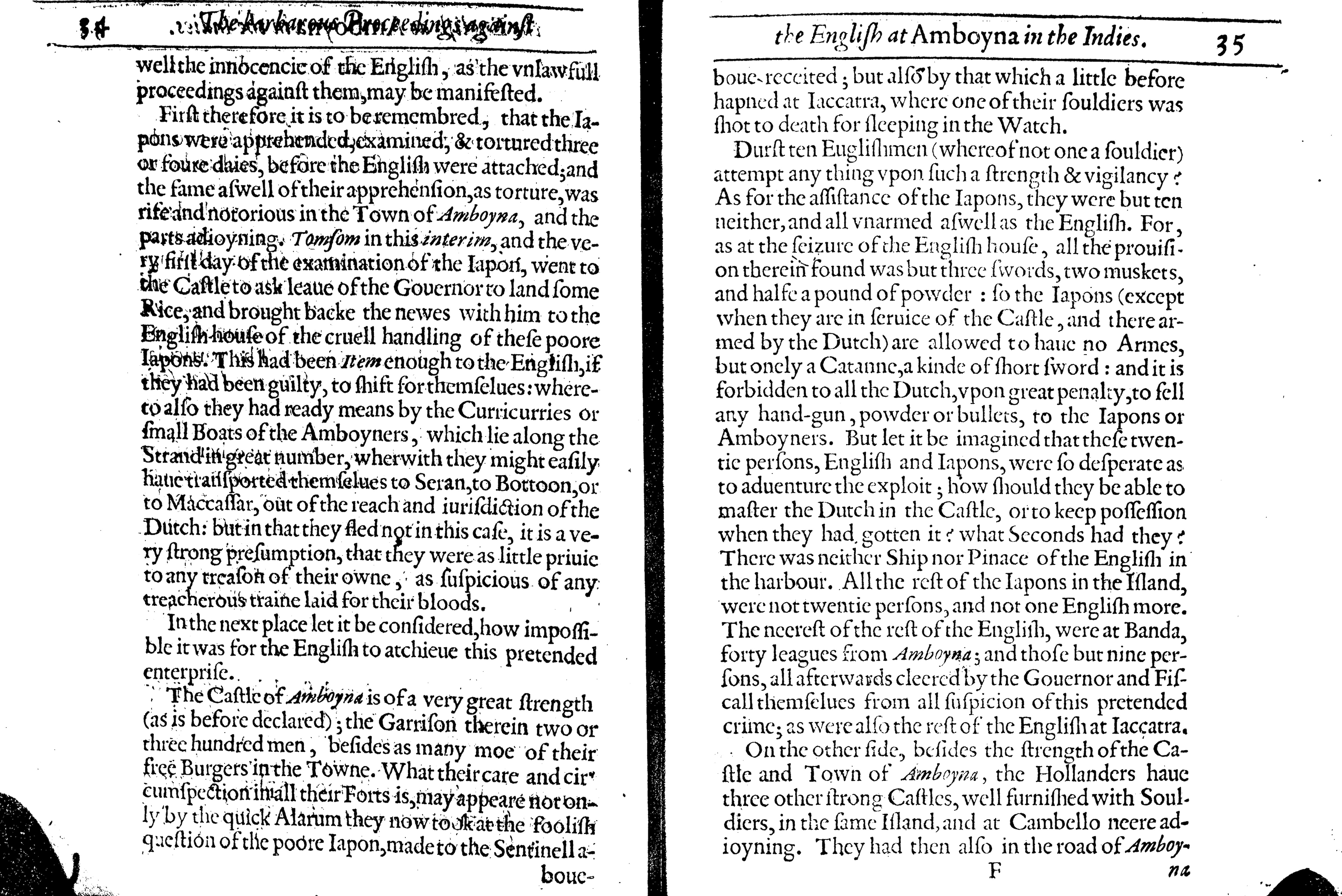 The second great controversy centers the feasibility of the supposed plot. The Dutch East India Company was well established at Amboyna where it maintained a castle and a powerful garrison. The Defense maintains that the plot was essentially impossible and hence it would never have been contemplated in the first place. Why plan to seize a castle if you lacked the means even to carry out the attack? The Prosecution argues on the other hand that the English were conspiring to launch an attack in secret with the help of a powerful fifth column, their Japanese allies within the castle, and that they would launch their attack at a moment when the garrison was depleted.